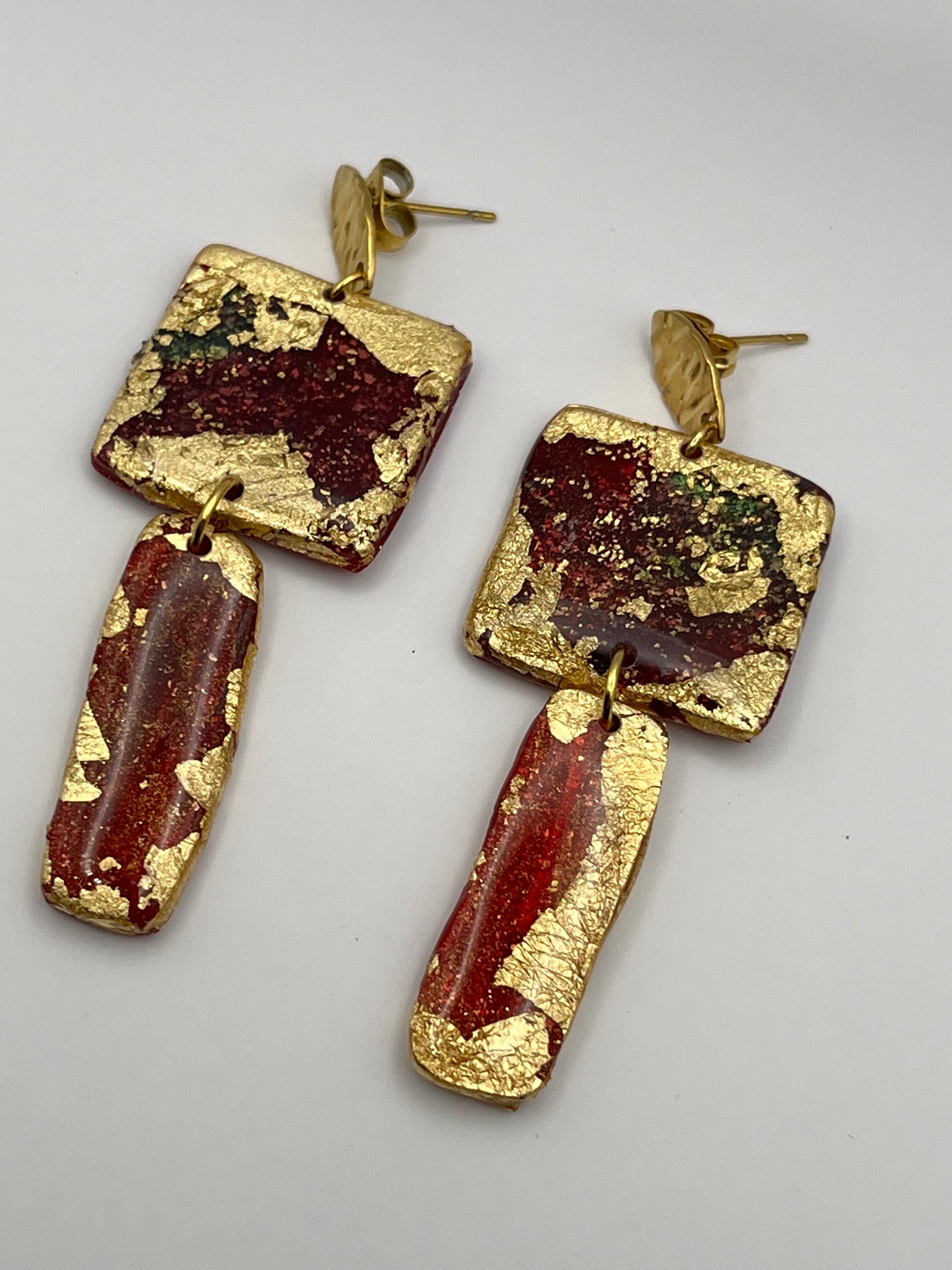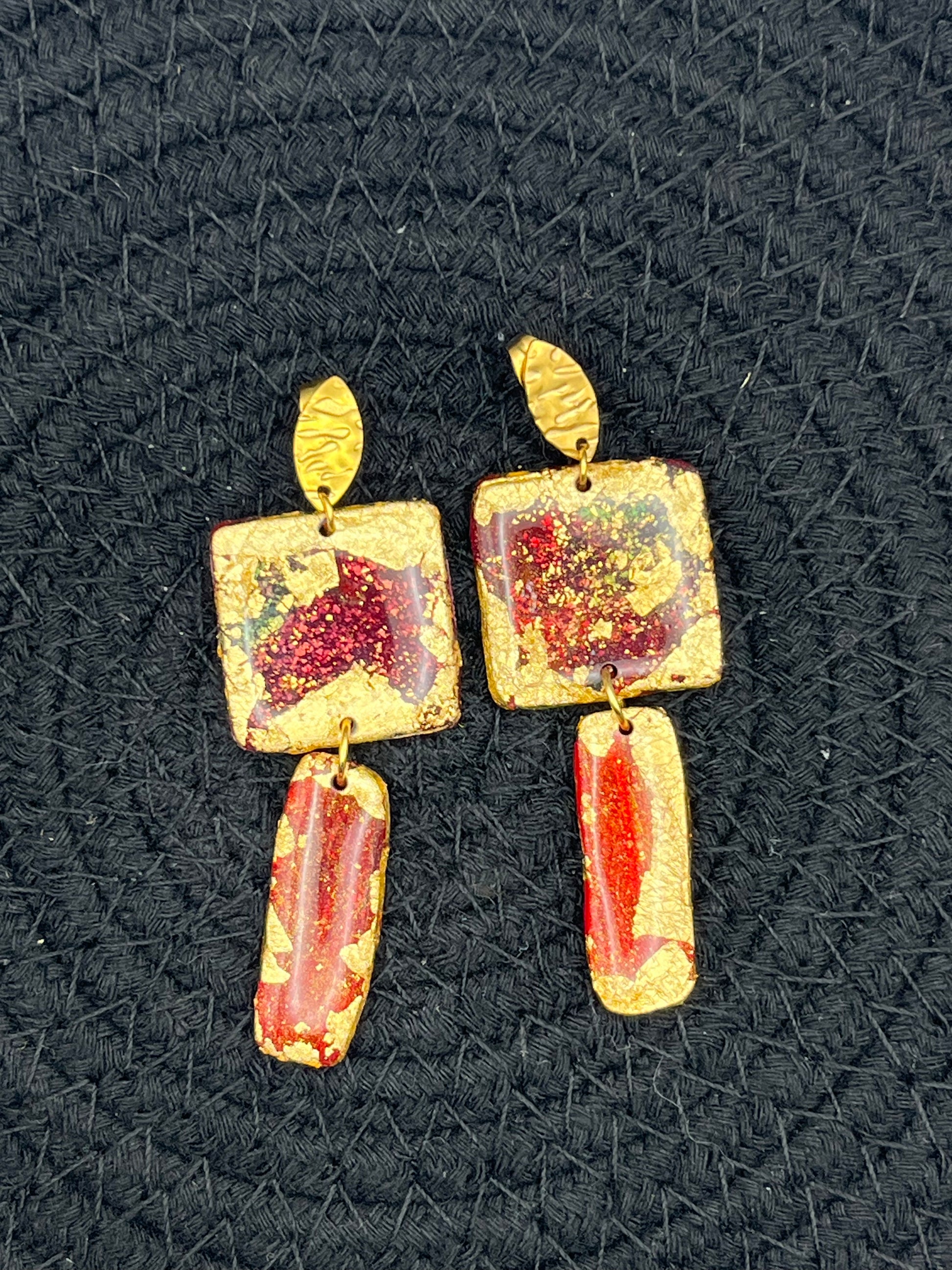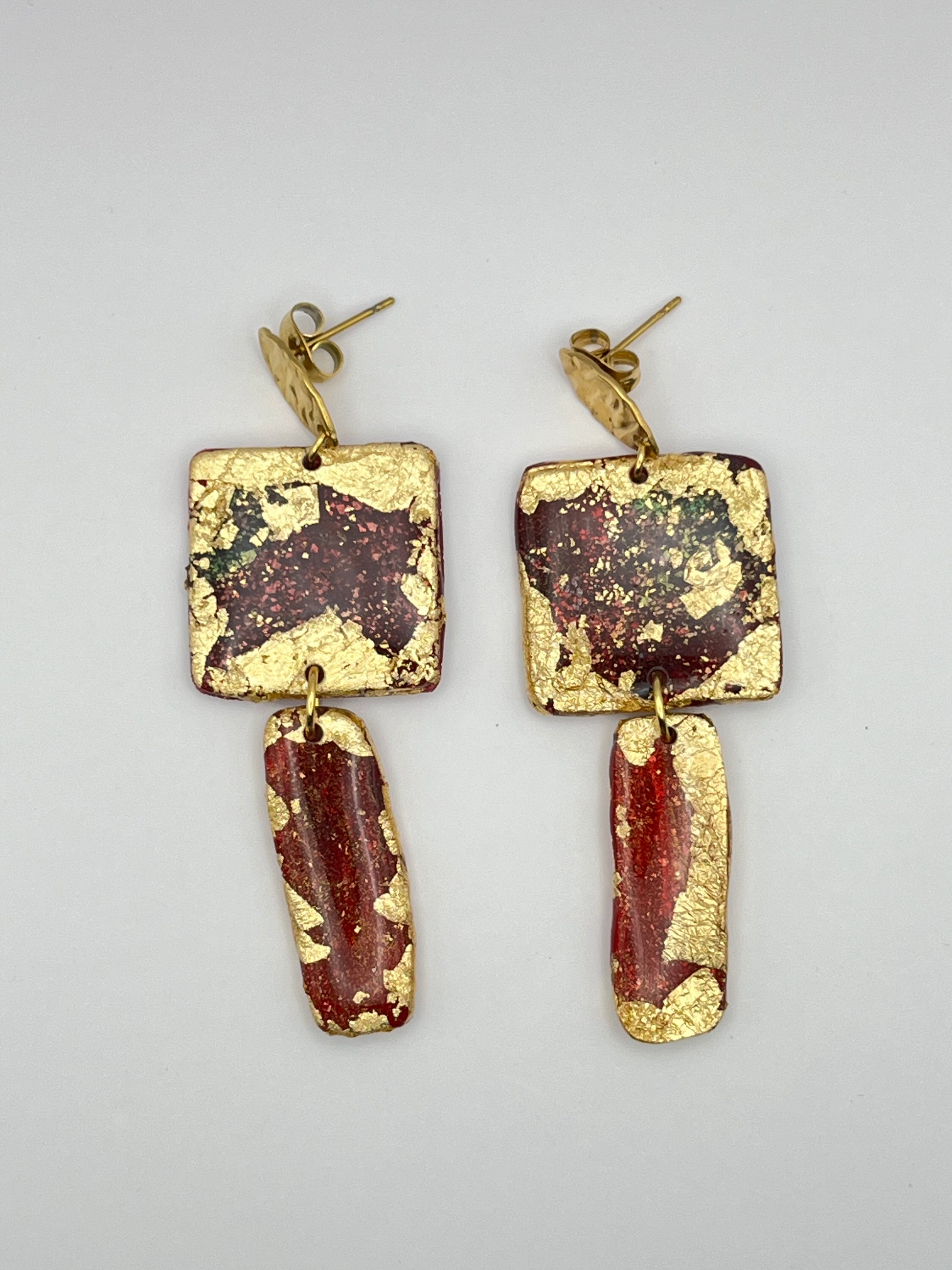 Boucles d’oreilles en pâte polymère et acier inoxydable. Tons rouge, vert, violet, rose fuchsia et doré.