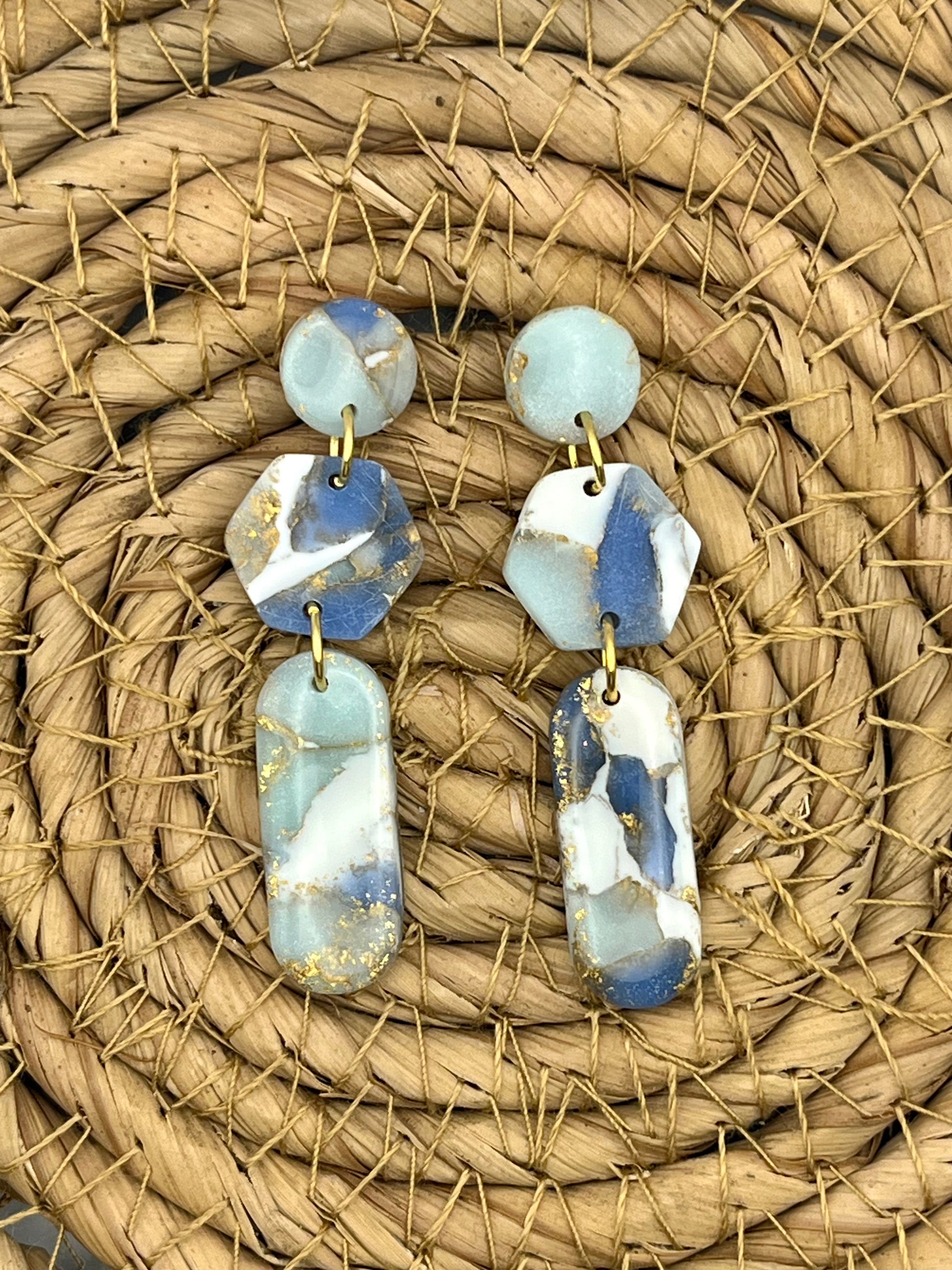 Boucles d’oreilles en pâte polymère bleue effets marbre. Tige en acier inoxydable. Deux effets sur les boucles, Matte et brillant.